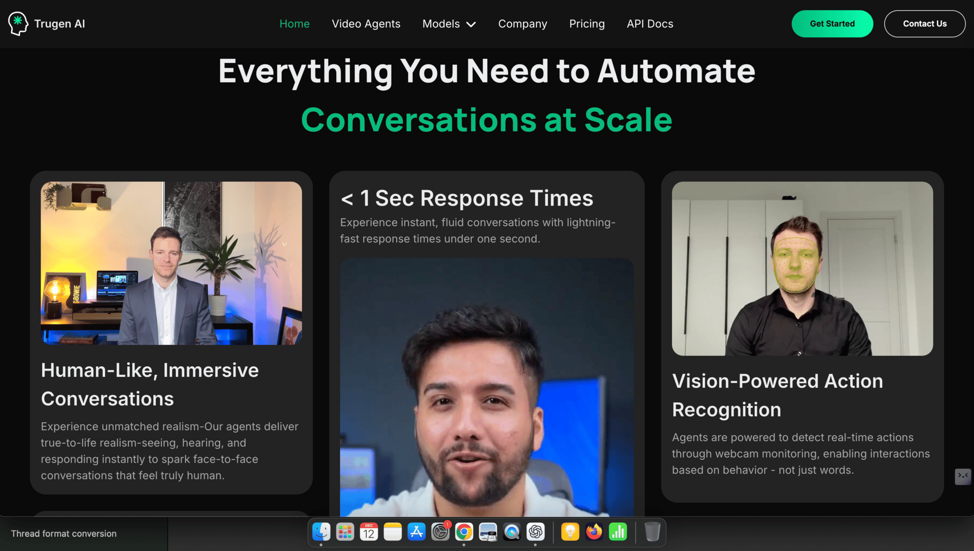Transform your standard chatbots and voice agents into hyper realistic video agents that can see, hear, and respond instantly. Powered by state of the art models, TruGen AI creates human like, expressive agents for sales, support, and coaching with near zero latency.