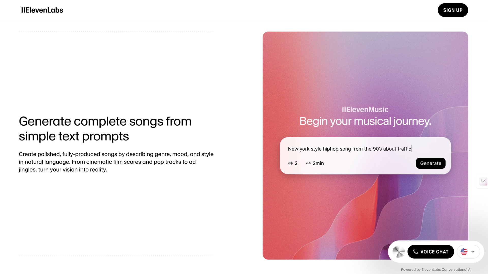 ElevenLabs Music lets you generate high-quality, studio-grade tracks—complete with vocals or instrumentals—across any genre or language using simple text prompts. Perfect for creators, marketers, or anyone needing a bespoke soundtrack